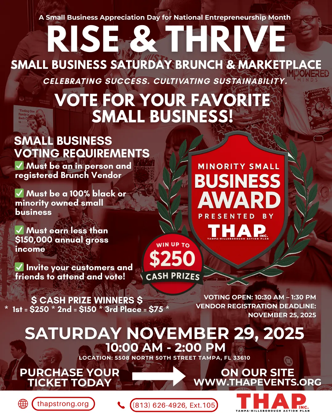 Click here to apply to the 5508 Minority Business Community, visit: www.thapstrong.org, or call 813-626-4926, Ext. 105.
